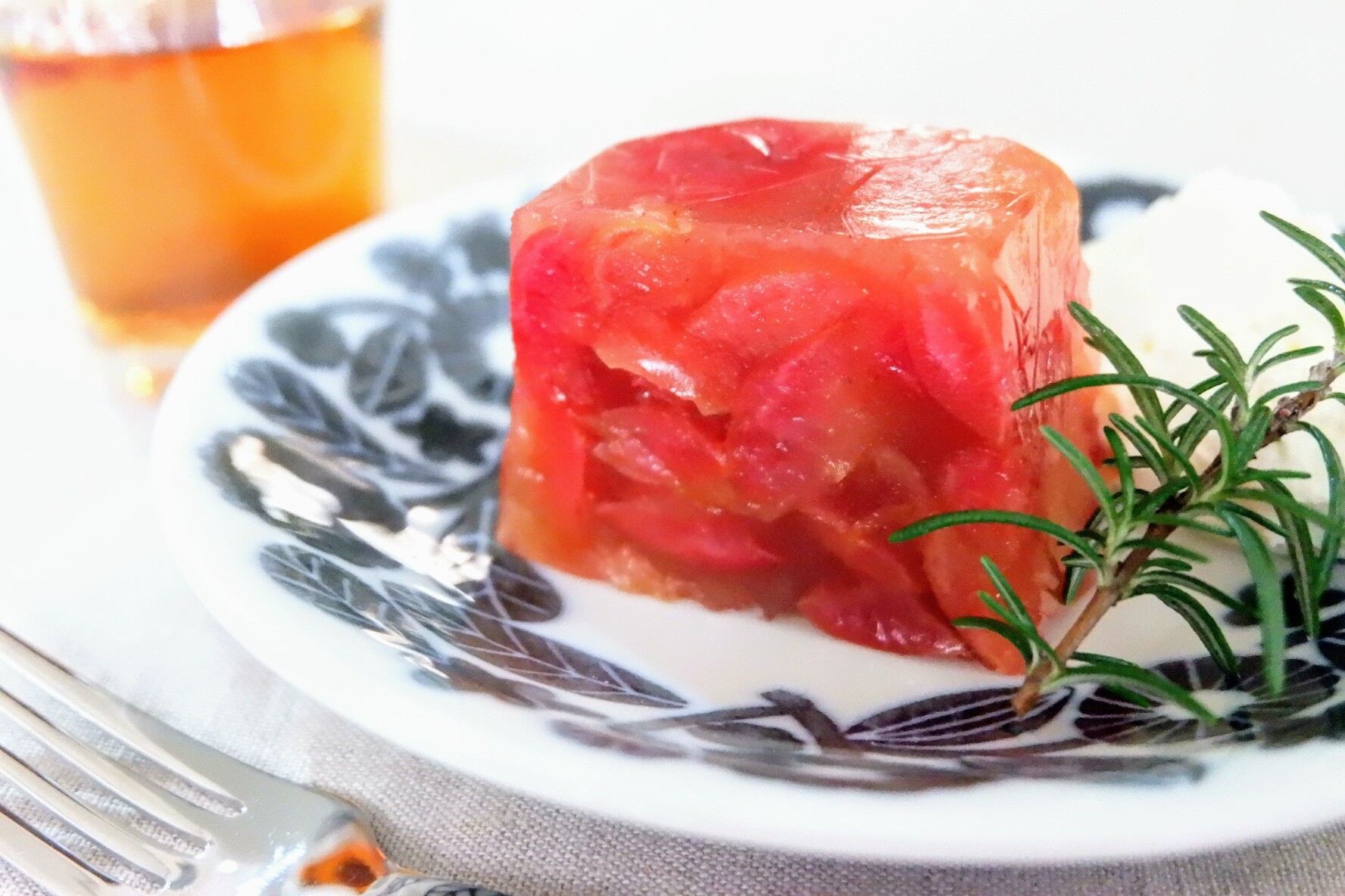 - 2の煮汁にゼラチンを入れて中火にかけて溶かし、2の型に流す。冷蔵庫で1時間半冷やし固め、3等分に切る。