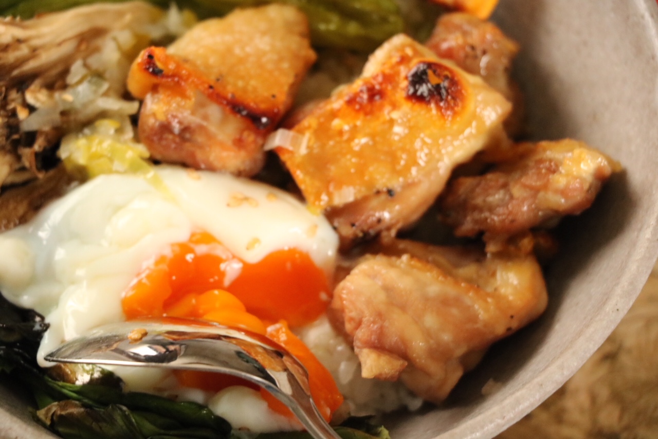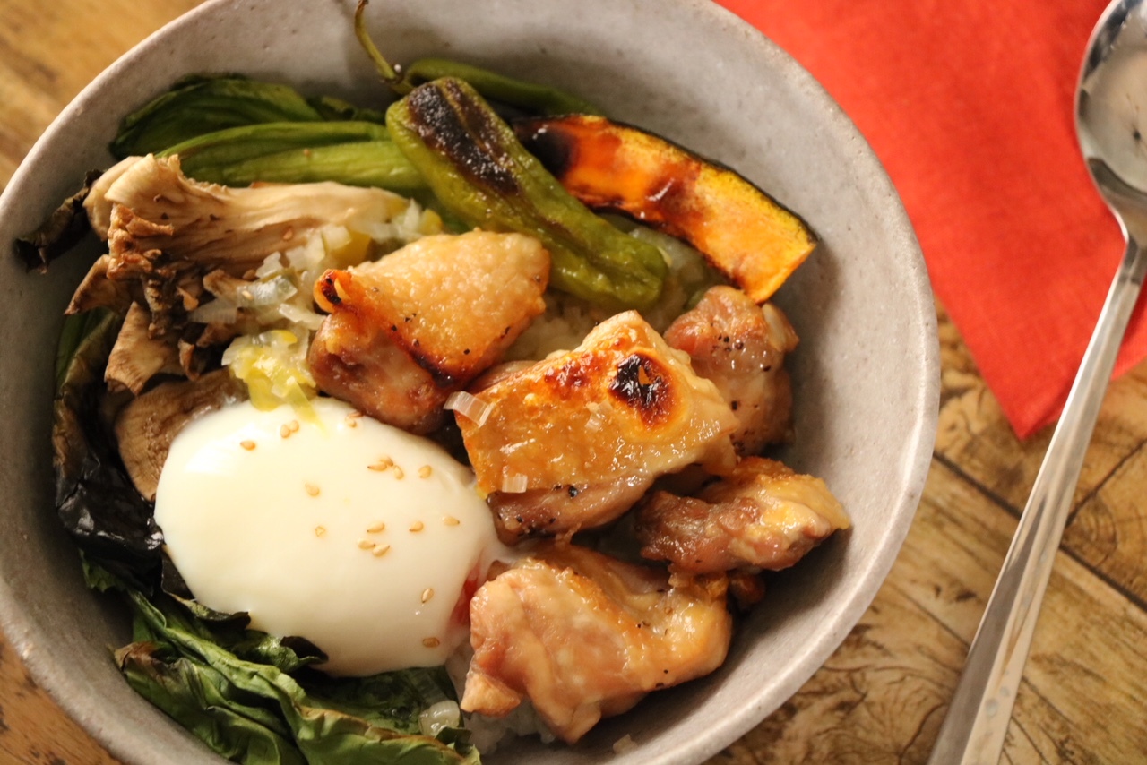 鶏肉を焼くときに好きな野菜も一緒に焼いてどんぶりにしてしまえば、簡単にバランスの良い一食になります。