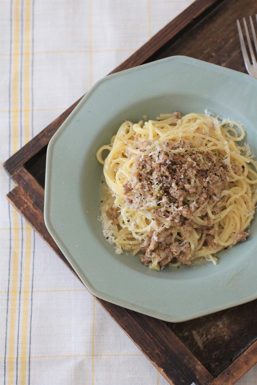 長ねぎの甘みと豚ひき肉の旨味がたっぷりからんだ白いボロネーゼです。