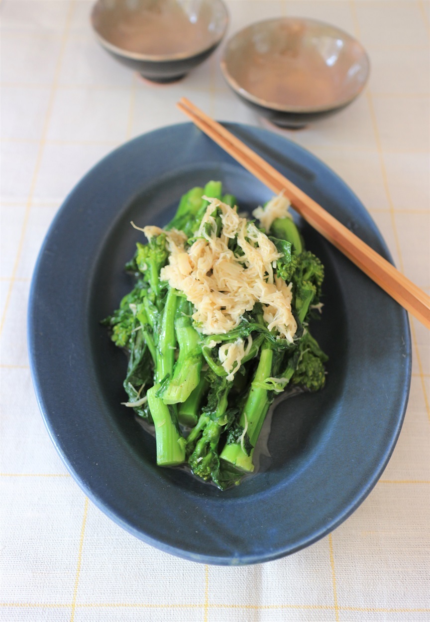 フライパンにオリーブ油・しょうがを入れて火にかけ香りを出し、菜の花を加えて炒め塩・こしょうをし、水(50ml)・ほたて缶を汁ごと加えて混ぜ蓋をし歯ごたえが残るくらいまで加熱する。塩・こしょうで味をととのえ器に盛る。