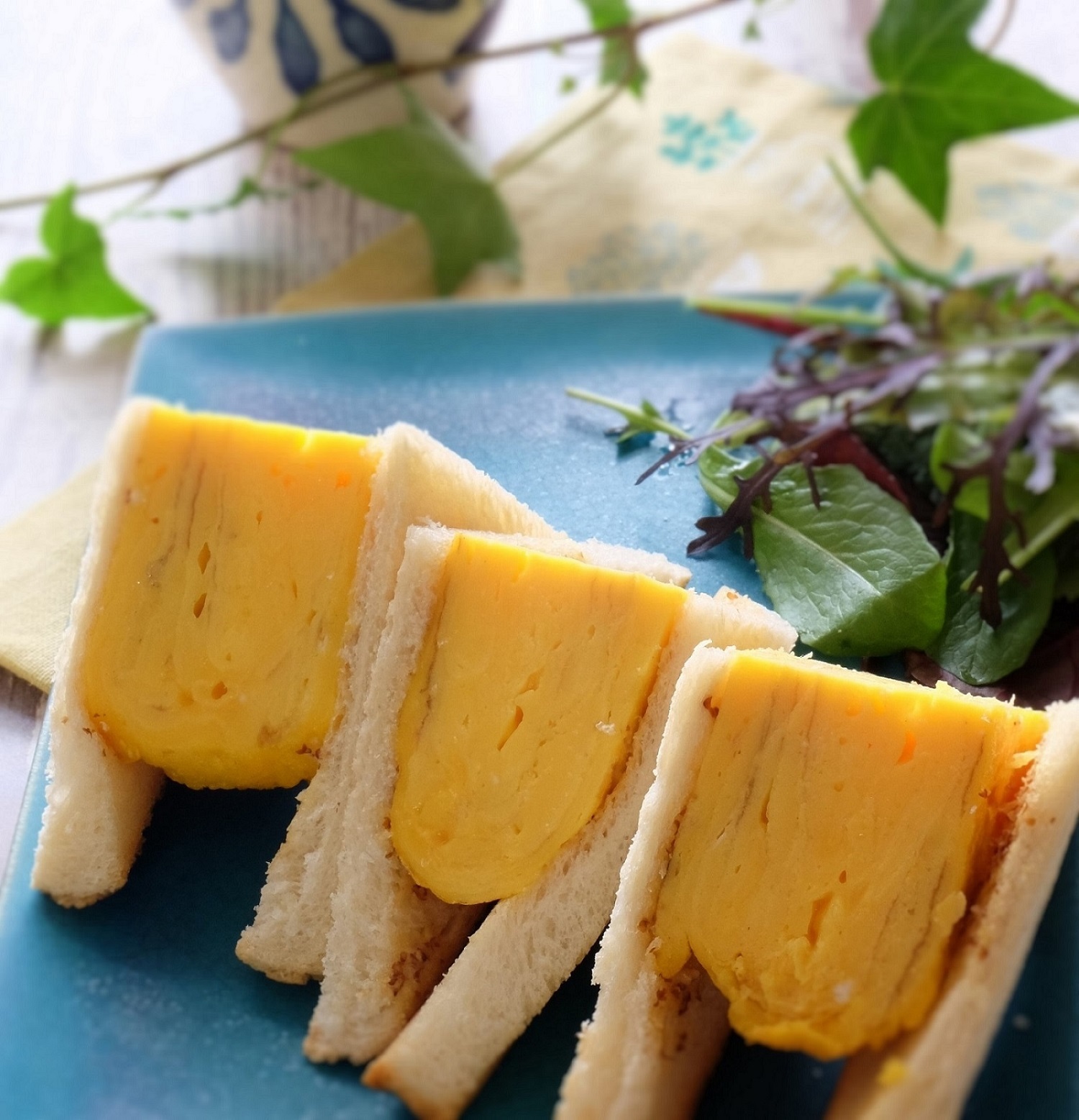 - トーストした食パンに②を挟んで、食べやすいサイズに切り、皿に盛り、ベビーリーフを添える。