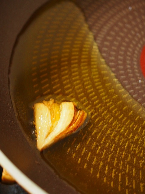 フライパンにオリーブオイル・にんにく・赤唐辛子を入れ弱火に熱し、じっくり炒めて香りを出しにんにくがきつね色になったら赤唐辛子と一緒に取り出す。