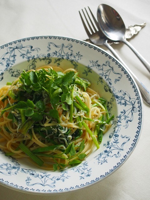しらすと香りの良い春の七草「せり」を使いシンプルに、にんにくと唐辛子、オリーブオイルで仕上げたパスタです。せりのしゃきしゃきした食感がたまりません!