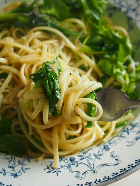 - 3のスパゲティーが茹で上がる直前に、ざるに入れたせりを入れ、さっと茹でる。スパゲティーと一緒に4に入れ和え、塩で味を調える。エキストラバージンオイルを仕上げに入れ和える。