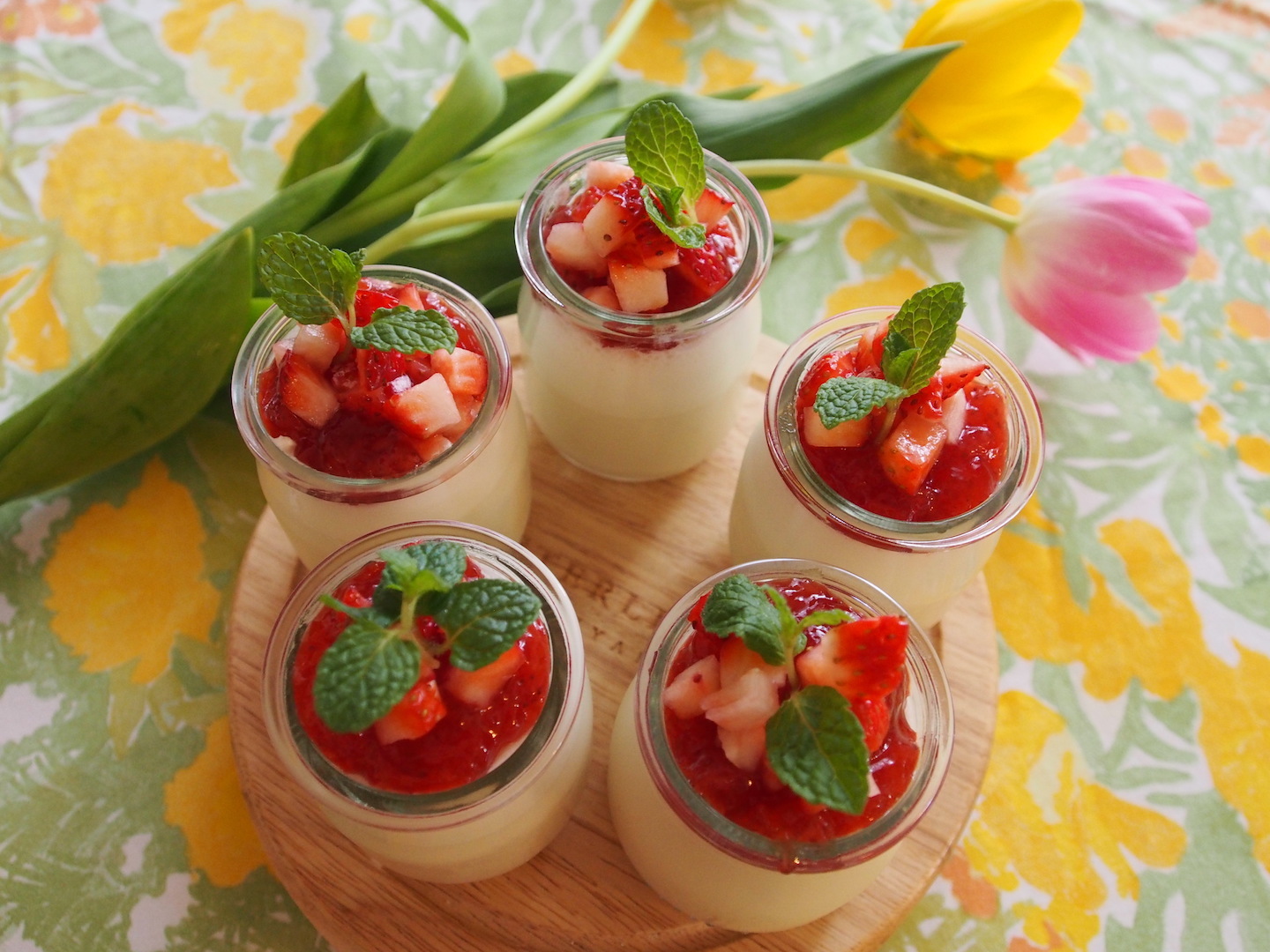 豆乳を使ったヘルシーなデザートです。いちごの代わりに黒蜜ときな粉をトッピングすると和風のデザートになります。
