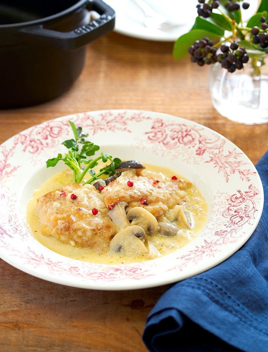 薄力粉をまぶして焼いた鶏肉を、白ワインビネガーを加えて煮込んで、お肉を柔らかく。ビネガーの酸味が深い味わいとなる、クリームソースができます。