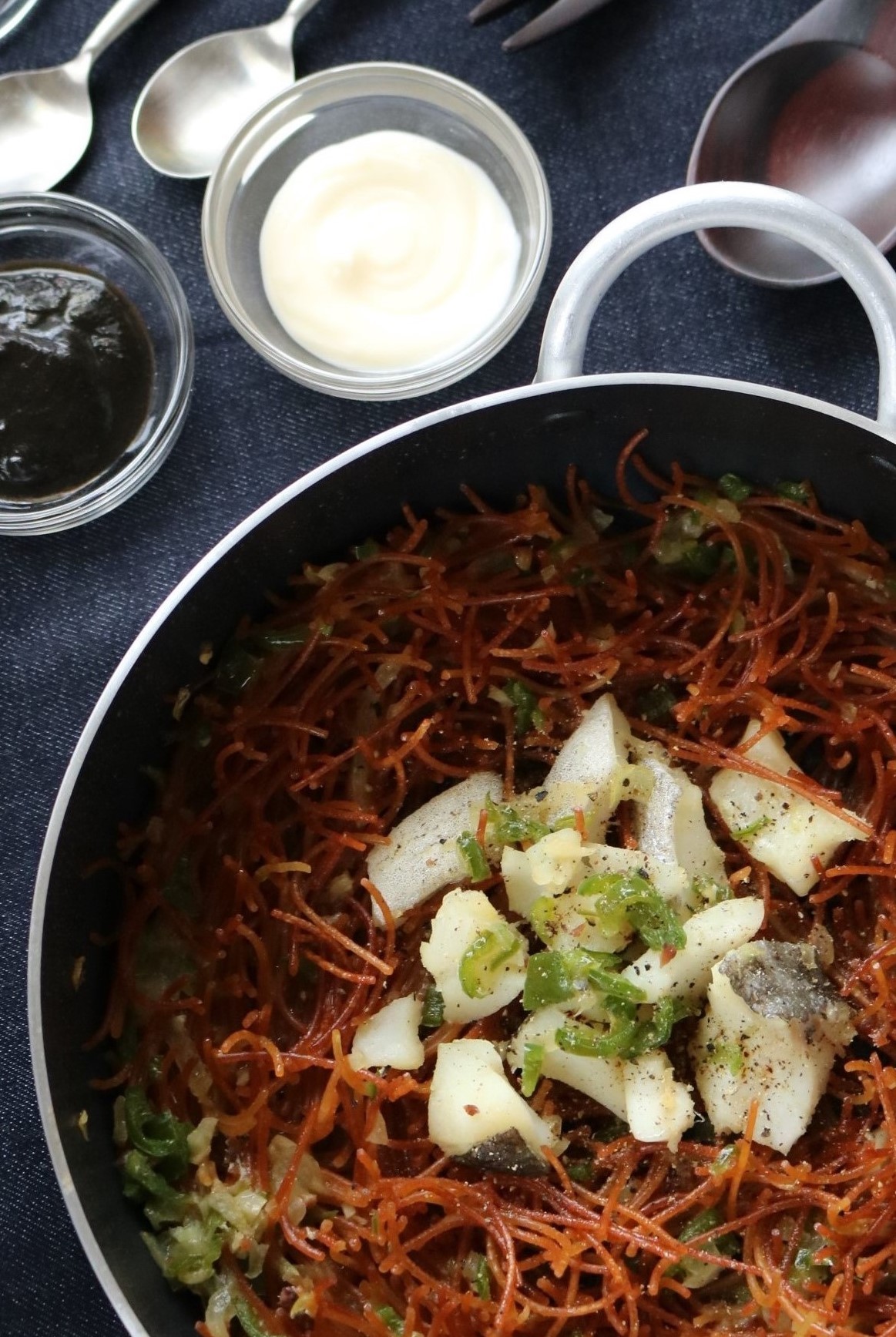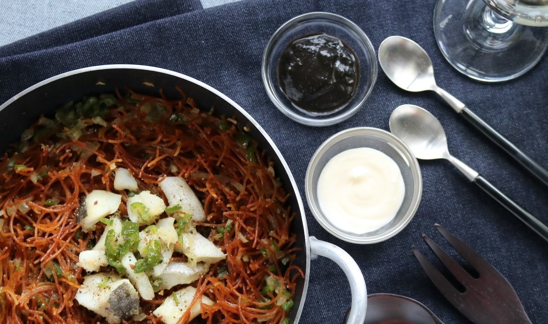 - パスタが立ってきたらオーブンから取り出し、耐熱用の器に乗せて、イカスミ・マヨネーズそれぞれ器にもり添えて出す。