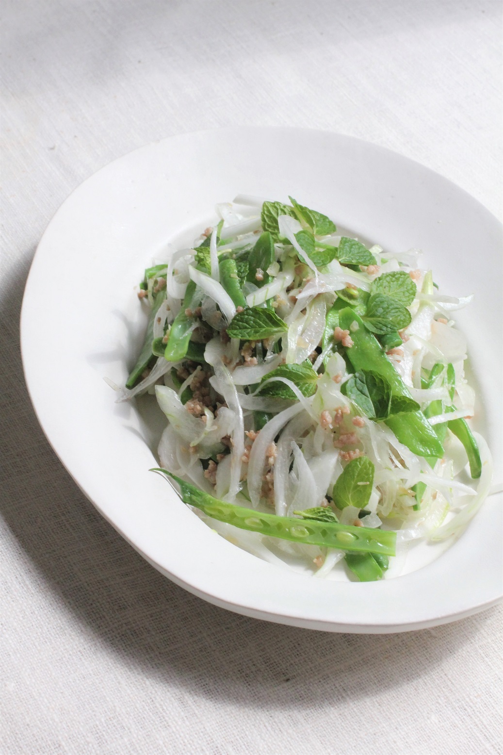 - ボウルに新玉ねぎ・いんげん・絹さや・レモン汁・2を汁ごと入れてあえる。味をみて薄い場合は塩で味をととのえ器に盛る。