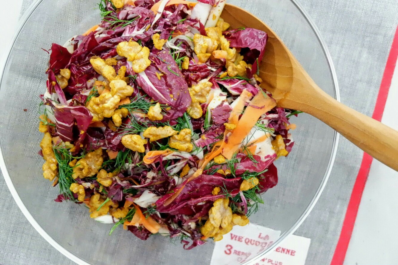 - ボウルにAを合わせてよく混ぜ、1のラディッキオ・人参・ディルを加えて和え、器に盛り、2を散らす。