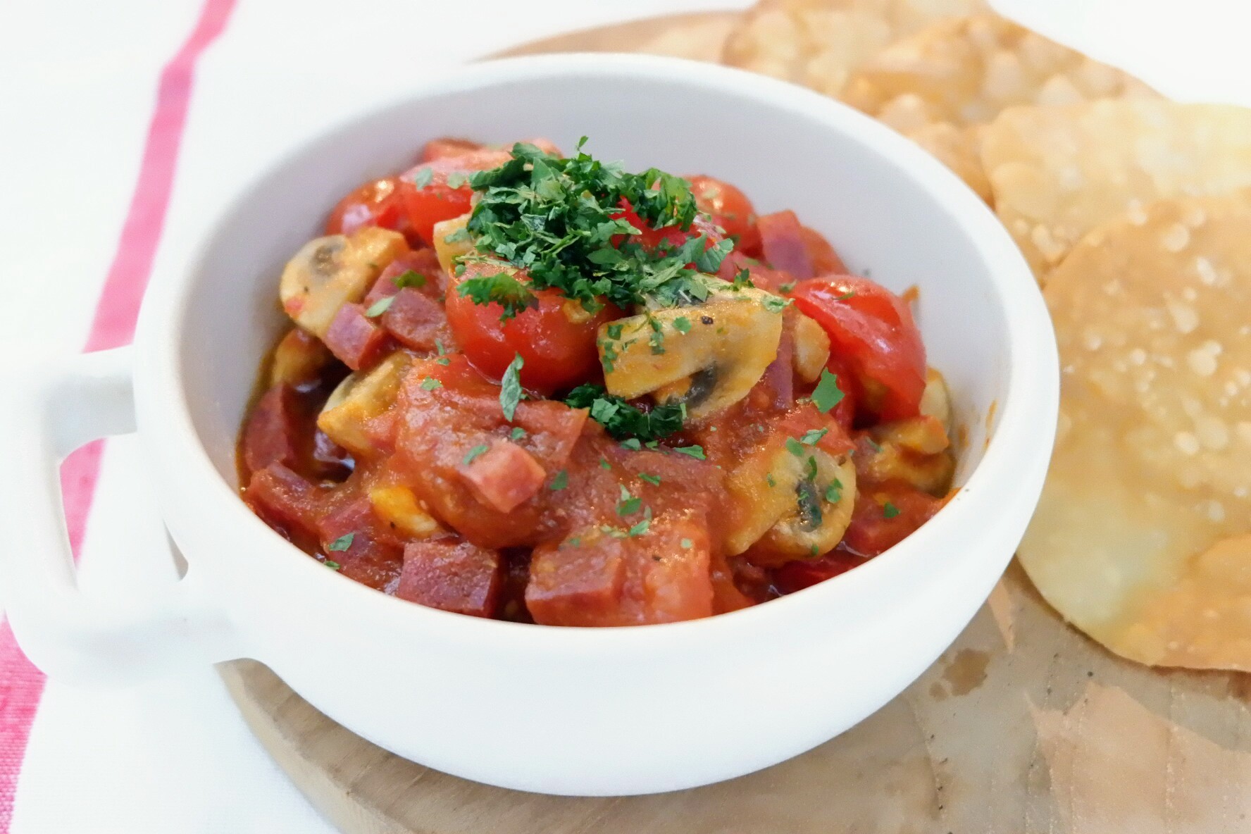 トマトとサラミのディップソース・トルティーヤチップス添え
