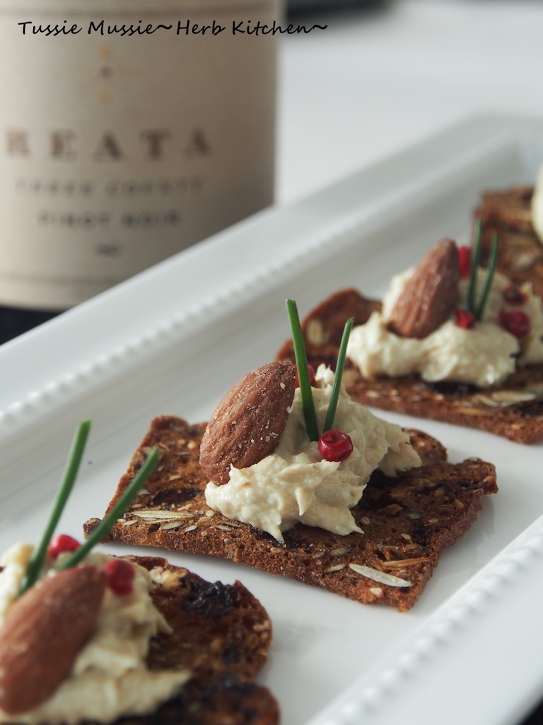 - クラッカーにのせ、ピンクペッパーやハーブ、アーモンドをトッピングする。