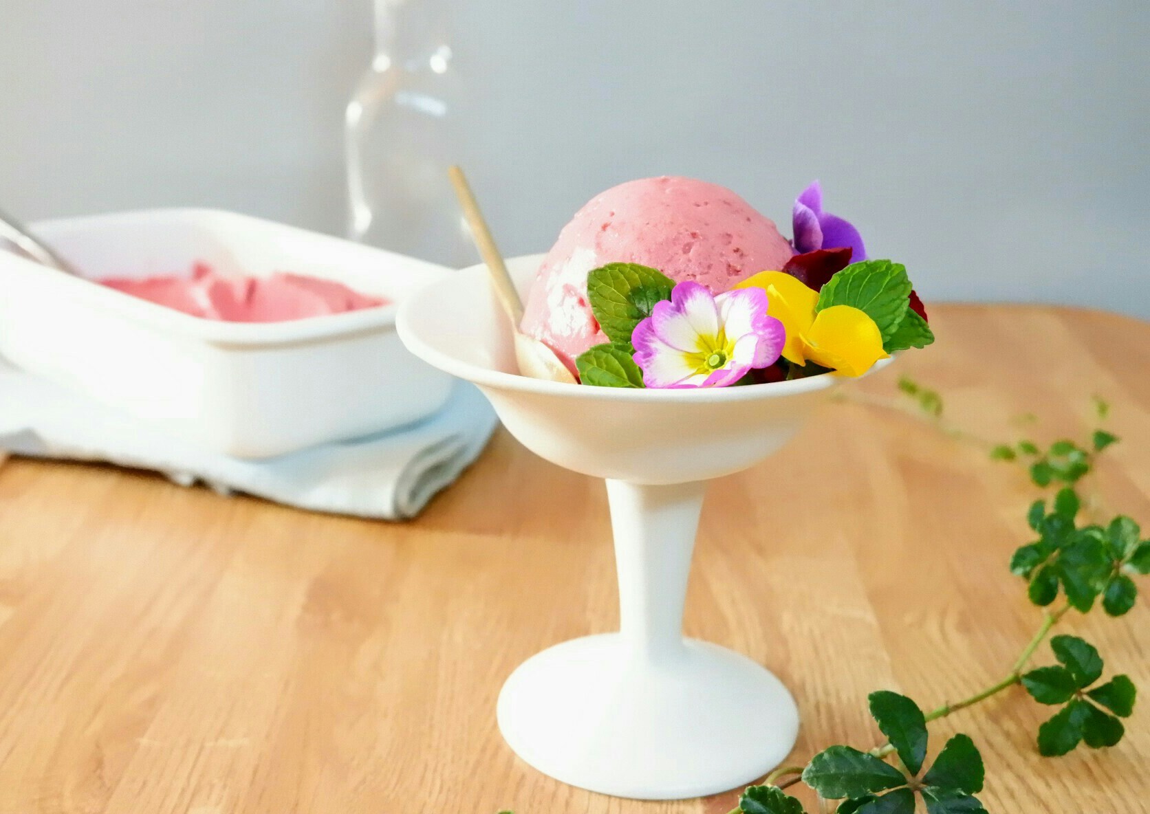 ラズベリーの甘酸っぱさとバナナのやわらかな甘み。 さっぱりと食べることができます。 おもてなしやパーティーの際は、エディブルフラワーを飾って華やかに‼