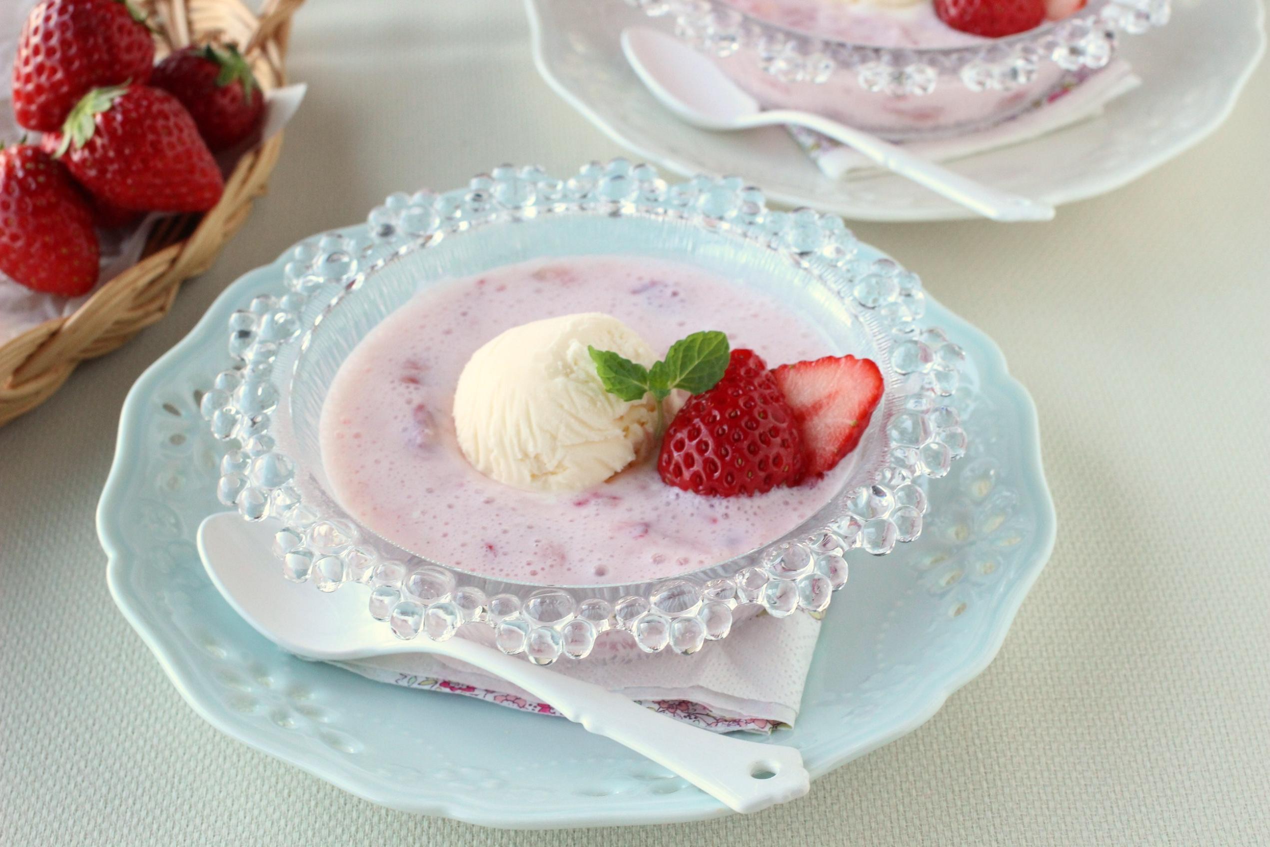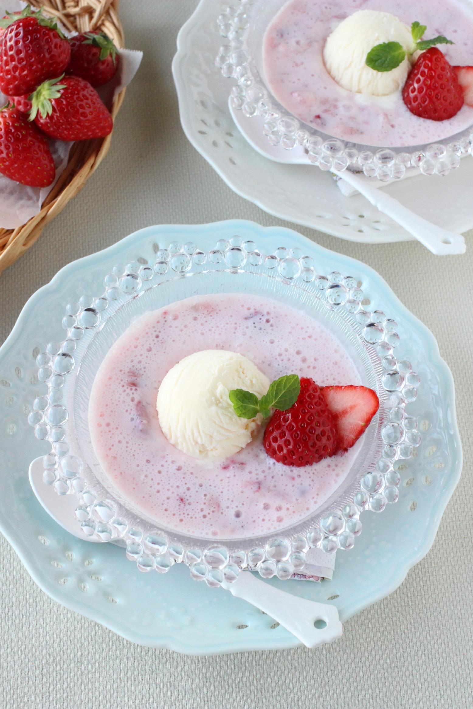 - 器に2を注ぎ、バニラアイス・いちごを添え、ミントを飾る。