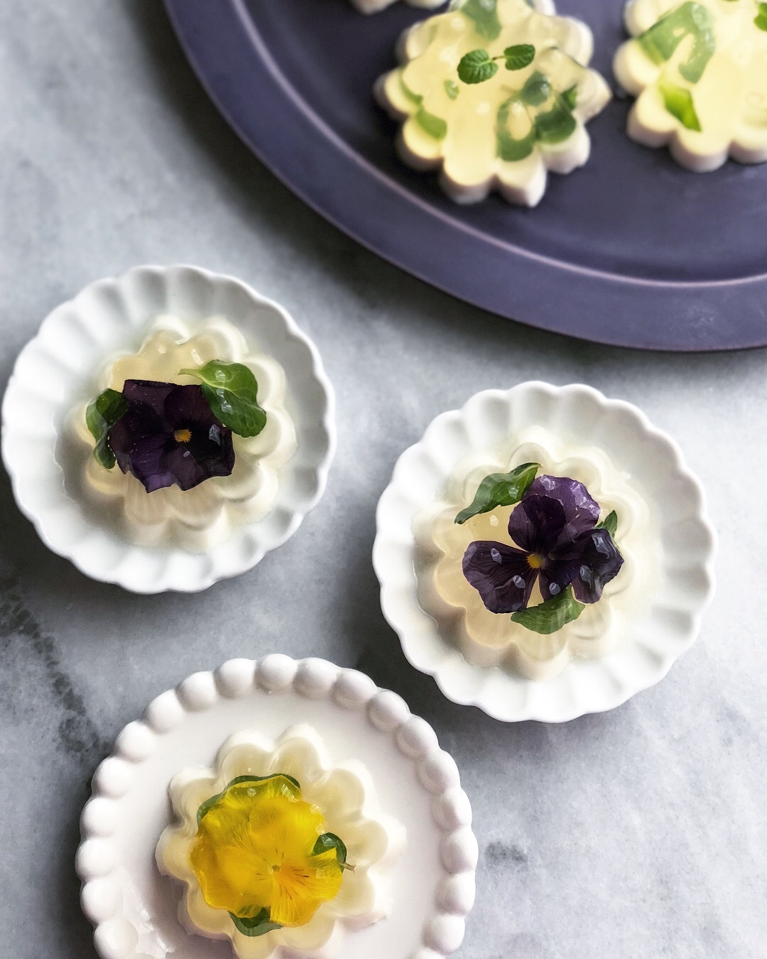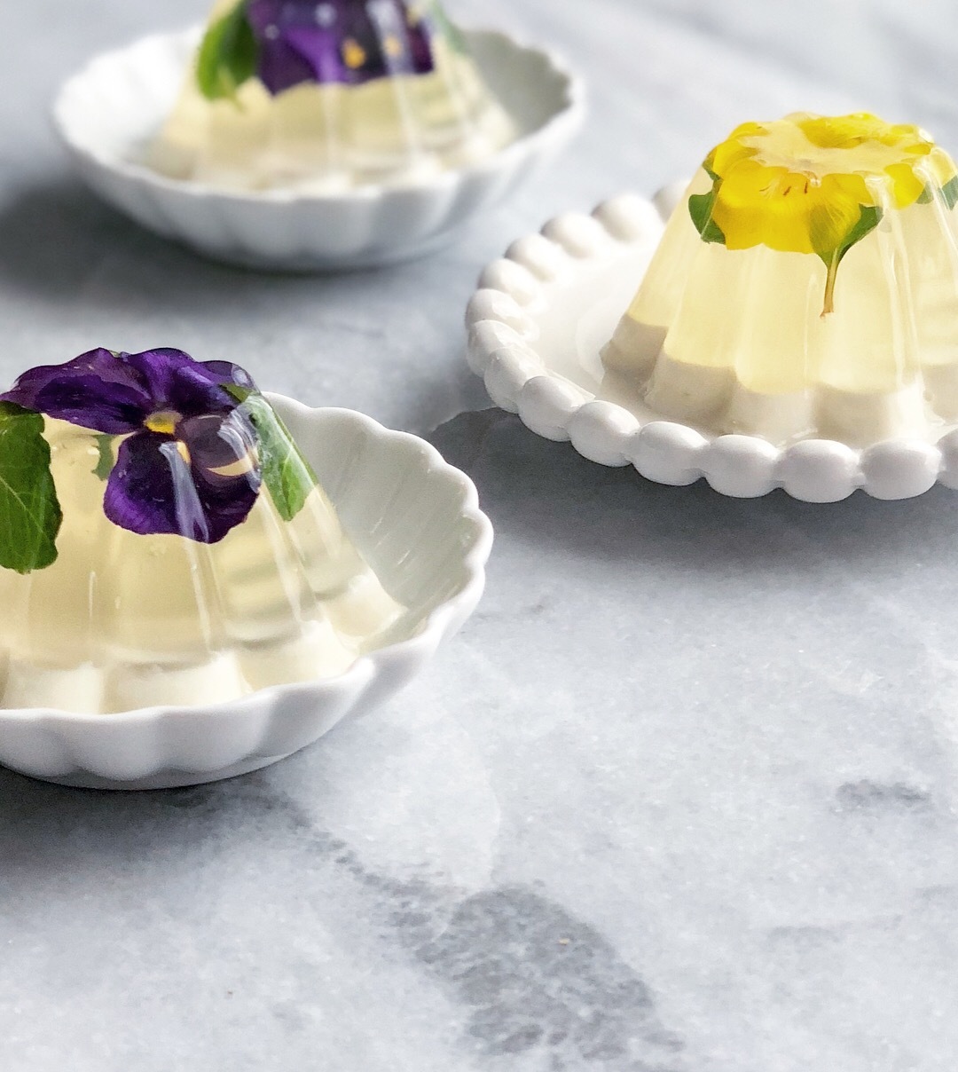 ゼリーの部分にエディブルフラワーやミントの葉を入れたら見た目も華やかでおもてなしにも!