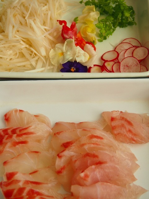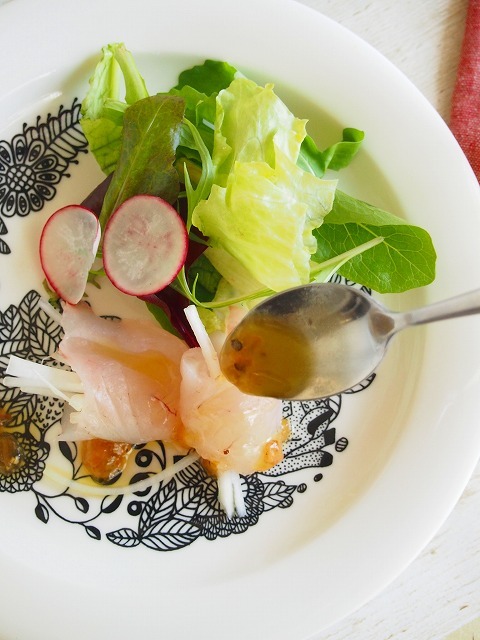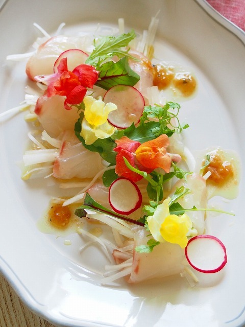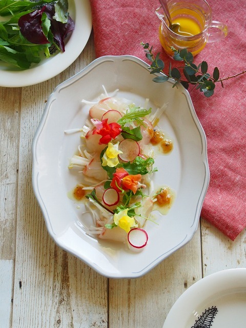 鯛にうどを軽く巻いてお皿に盛る。上にベビーリーフ・エディブルフラワー・ラディッシュ・セルフィーユを乗せ2の梅ドレッシングをかける。