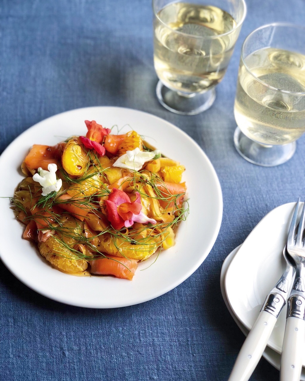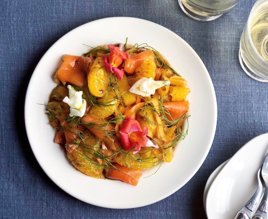 いよかんの爽やかさと、リボン状にした人参に甘めのバルサミコドレッシングが絡み、いくらでも食べられる美味しさです。エディブルフラワーとフェンネルを飾り華やかな前菜に!