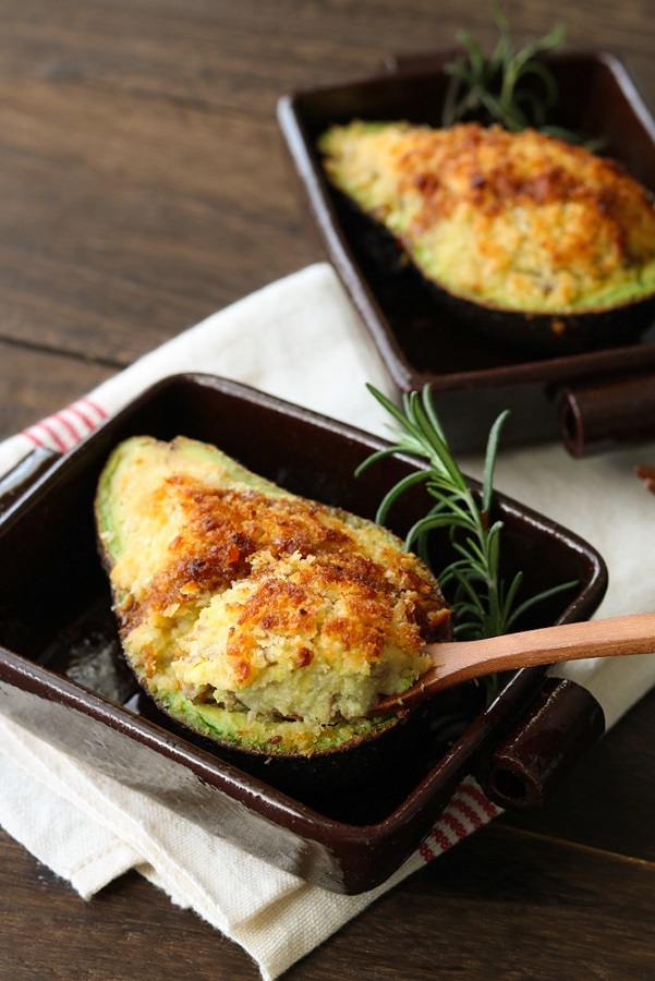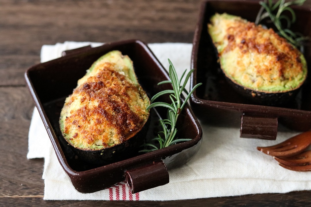アボカドカップにコロッケ種を詰めた焼きコロッケ風。クリーミーなアボカドとホクホクじゃがいもがよく合います。パンなどを合わせてどうぞ♪