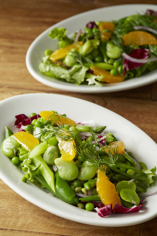 - 器にグリーンリーフとトレビスを敷き、工程3を盛り付け、オレンジを飾る。