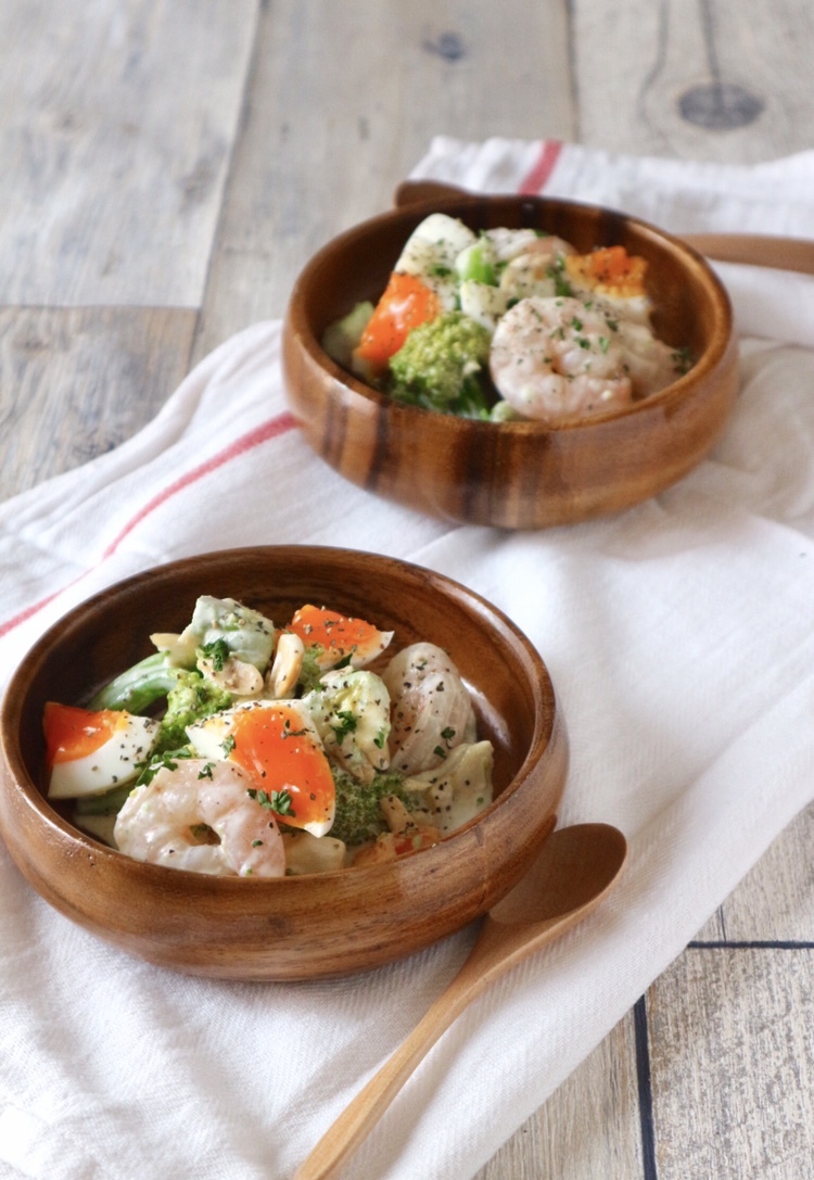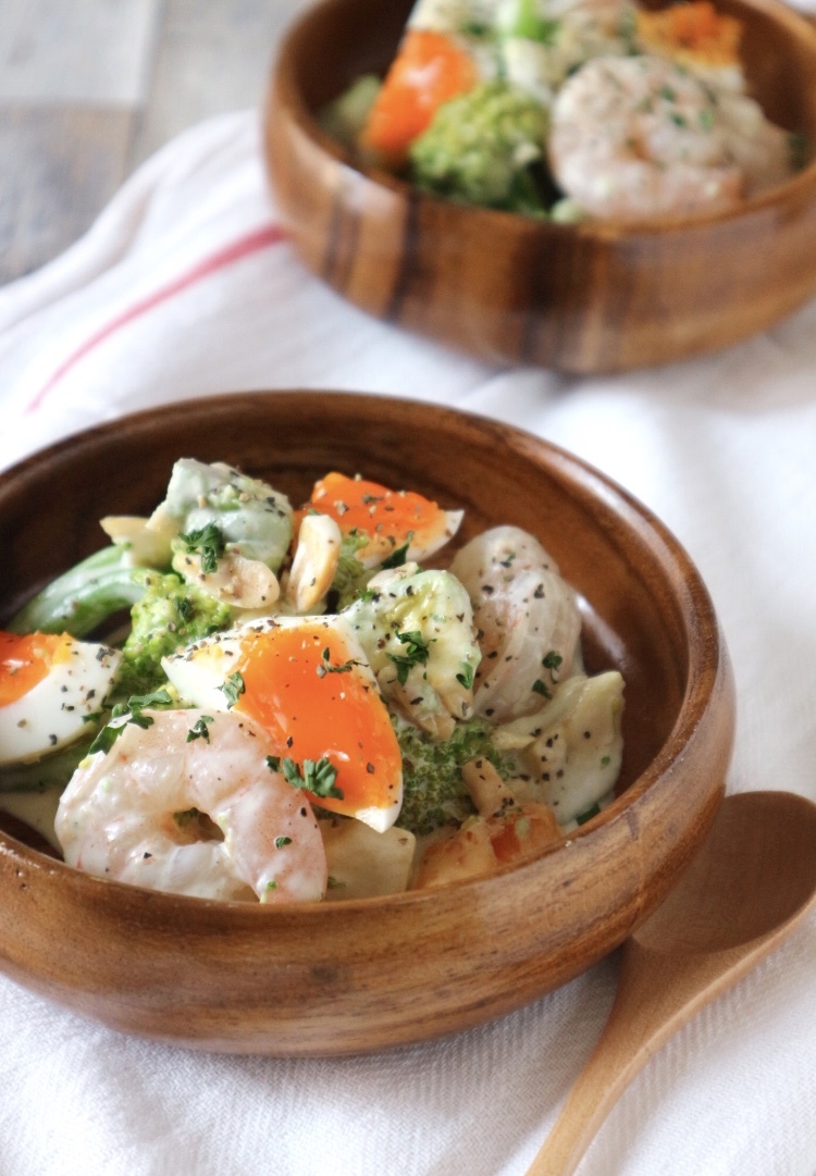 - 鍋に湯を沸かし、むきえび、ブロッコリーを順に茹でザルにあげ粗熱を取る。