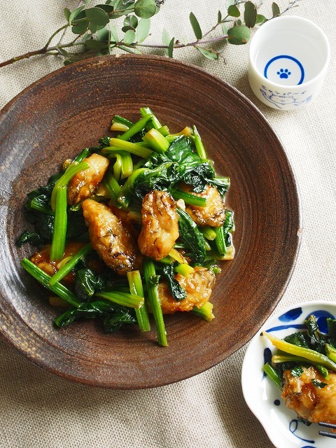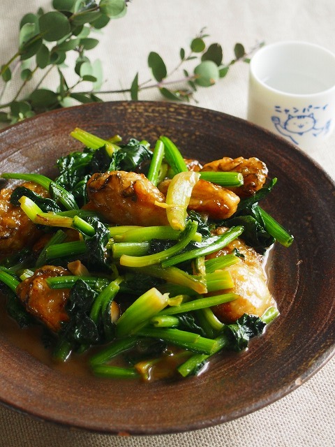 ほうれん草のバター炒めにかきを入れて甘辛い味付けにしご飯やお酒が進むメインになるおかずです。