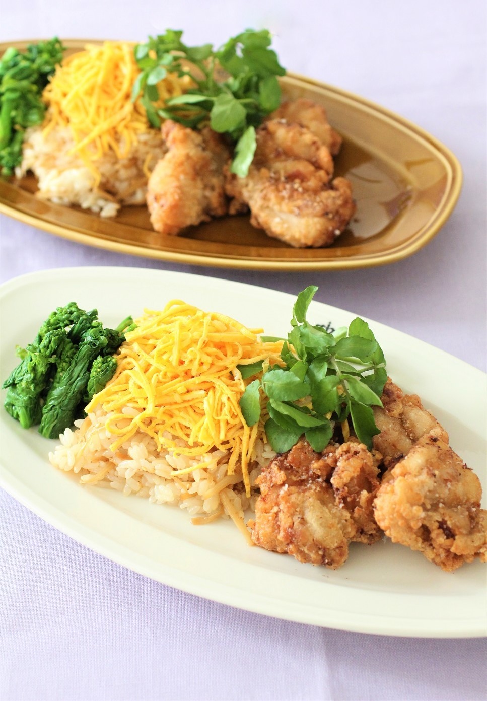 - 器に梅風味のから揚げ・うどのきんぴらのまぜ寿司・菜の花のわさびあえを盛り、まぜ寿司に錦糸卵をのせる。