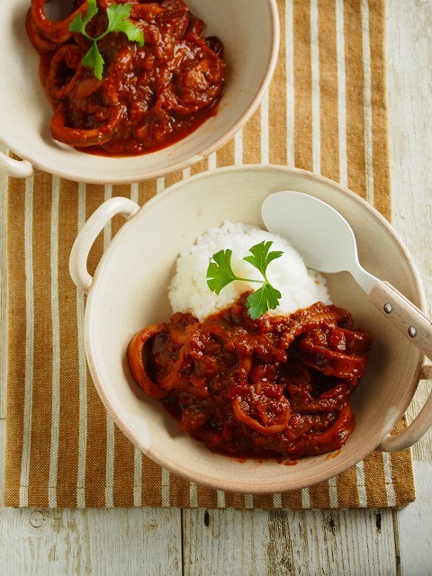 - 2にイカを入れ表面が白くなったら白ワインを入れアルコールをとばしトマト缶をつぶしながら入れ、ふたをする。強火にし圧力ピンが上がったら8分圧をかけ火を止める。