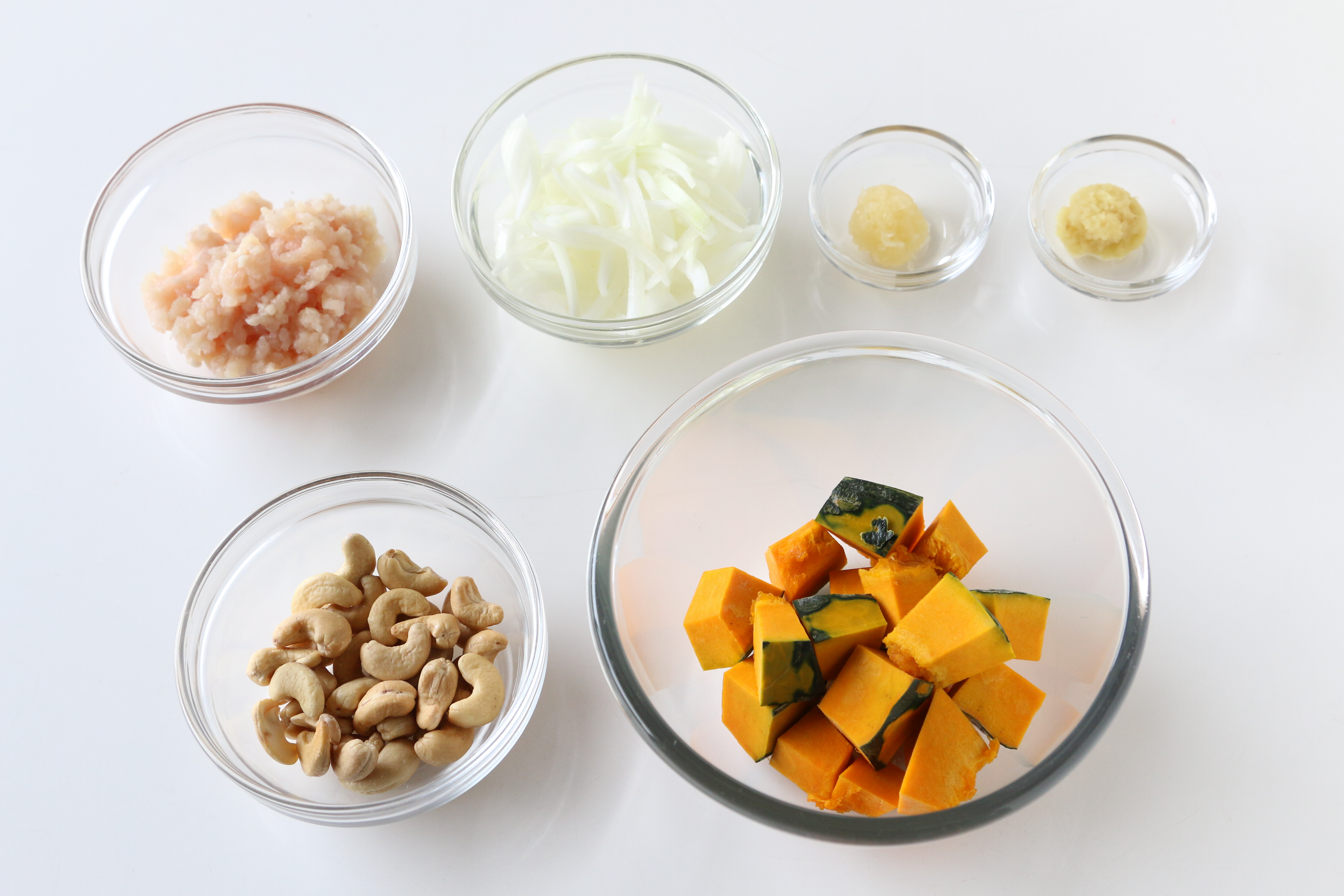 - フライパンにココナッツオイル、にんにく・しょうがを入れ火にかける。香りがしてきたら、鶏ひき肉・かぼちゃ・カシューナッツを加え中火で炒める。