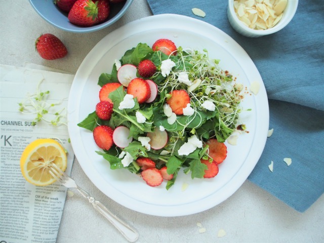 いちごが入った可愛い春サラダ。いちごの甘酸っぱさとルッコラのほろ苦さをバルサミコドレッシングがまとめます。リコッタチーズの代わりにカッテージチーズでも美味しくできます。
