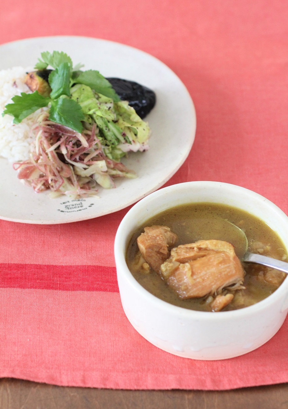 - 和風スープカレー・雑穀ごはんを別の器に盛り、ごはんに揚げなす・みょうがのレモン山椒あえ・きゃべつのゆかり漬けを添える。
