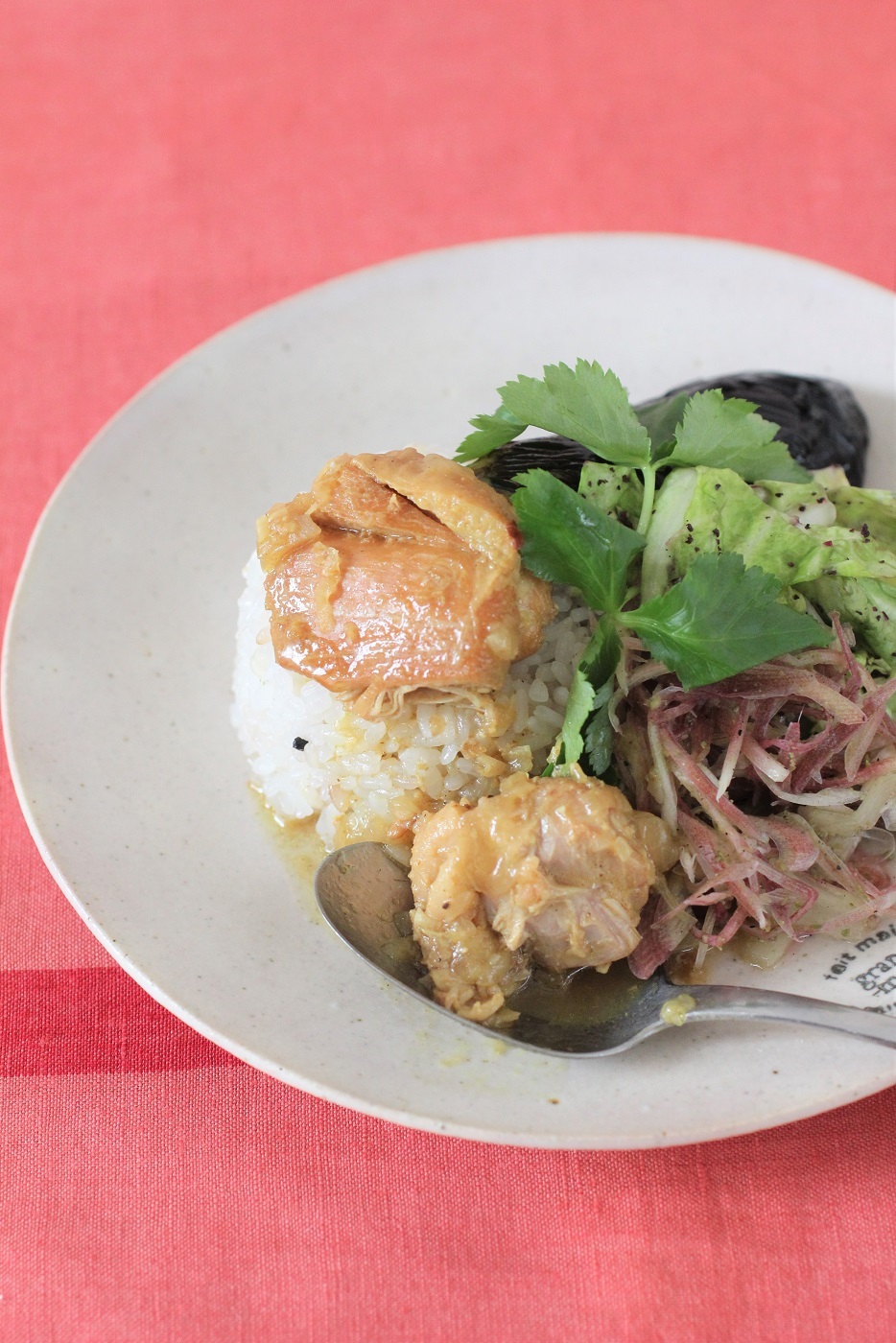 - 鍋にごま油・玉ねぎを入れて火にかけ濃い目のきつね色になるまで炒め、1を汁ごと加えて鶏肉に焼き色をつけ、カレー粉を加えて炒める。