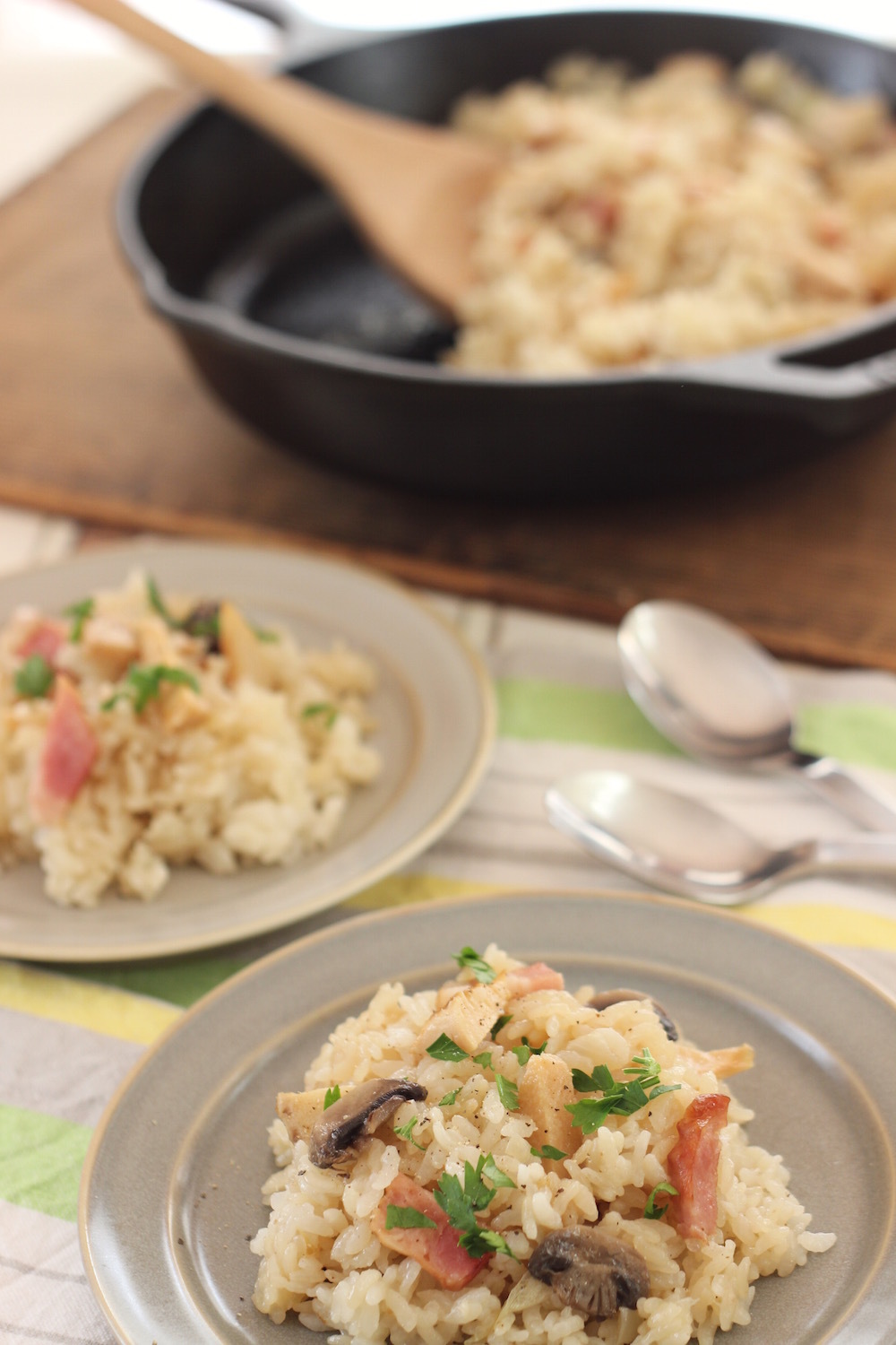 - 別の大きめのフライパンを弱めの中火にかけ、オリーブオイル(小さじ2)を入れ、にんにく、たまねぎを入れて香りが出るまで炒め、さらにベーコン、米を入れ、米が透き通るまで炒めたら、B、ローリエ、3の筍、マッシュルームを入れ てさっと混ぜて表面をならし、沸騰したら蓋をして弱火で15分煮る。