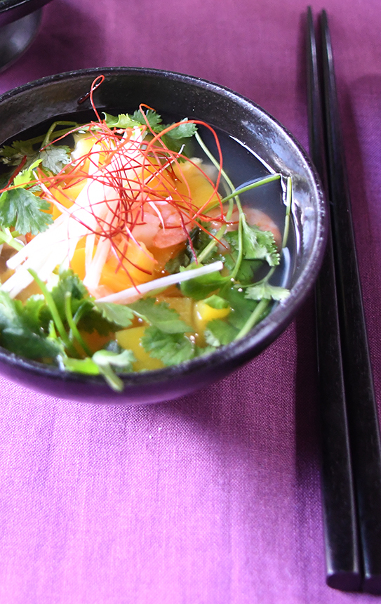 - 器に[4]を注ぎ、パクチーを混ぜる。白髪ねぎ、糸唐辛子を飾る。