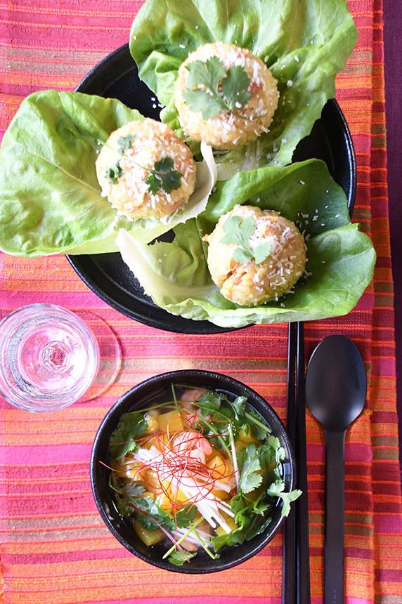 セットメニューの「タイ風カレーおにぎり」は、レシピ一覧ページで検索して頂きますと閲覧できます。