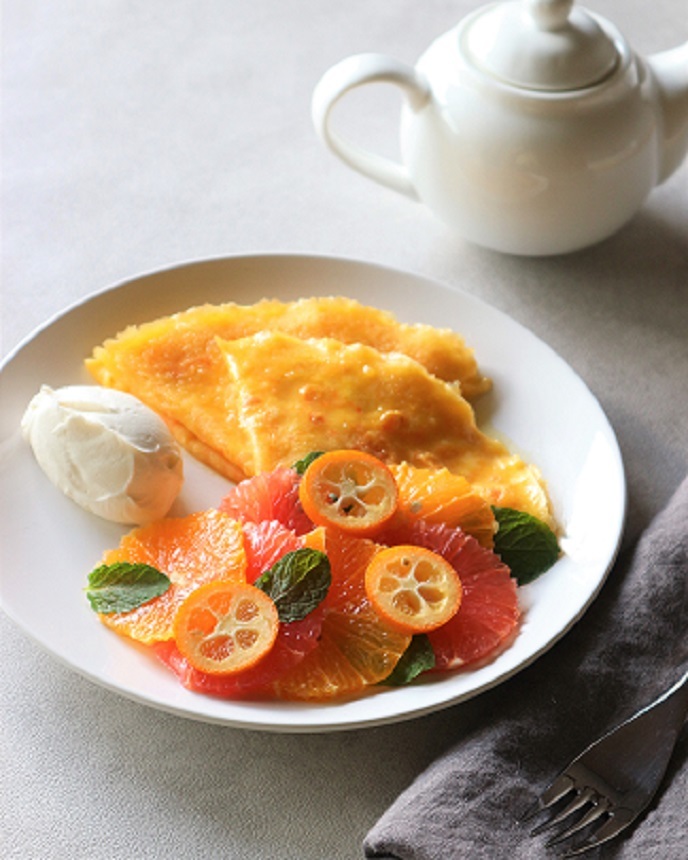 - 皿にクレープをのせ、ソースをかけ、オレンジ果肉、マスカルポーネ、ミントを添える。