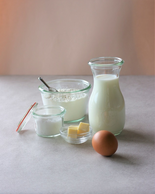 - ボウルにホットケーキミックス・塩を入れ、牛乳を少しずつ加え、粉っぽさがなくなったら、残りの牛乳・溶き卵を加え混ぜる。