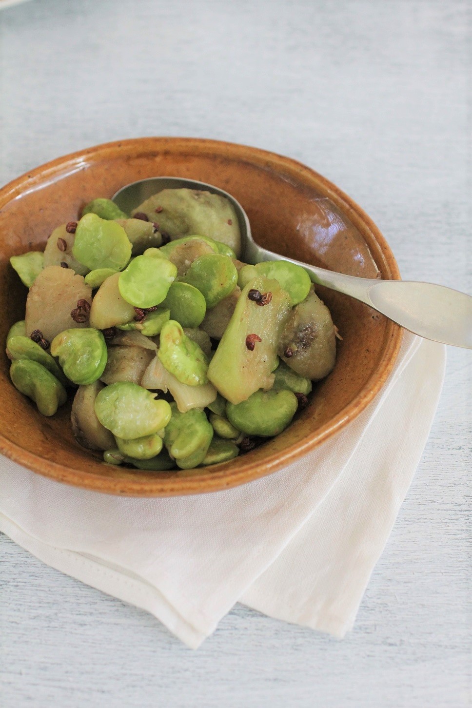 - フライパンにごま油・にんにく・花椒・塩を入れて火にかけ香りを出し、そら豆・なすを入れて炒め全体に油が馴染んだら弱火にして蓋をし、途中混ぜて5分位蒸し焼きにする。塩で味をととのえ器に盛る。