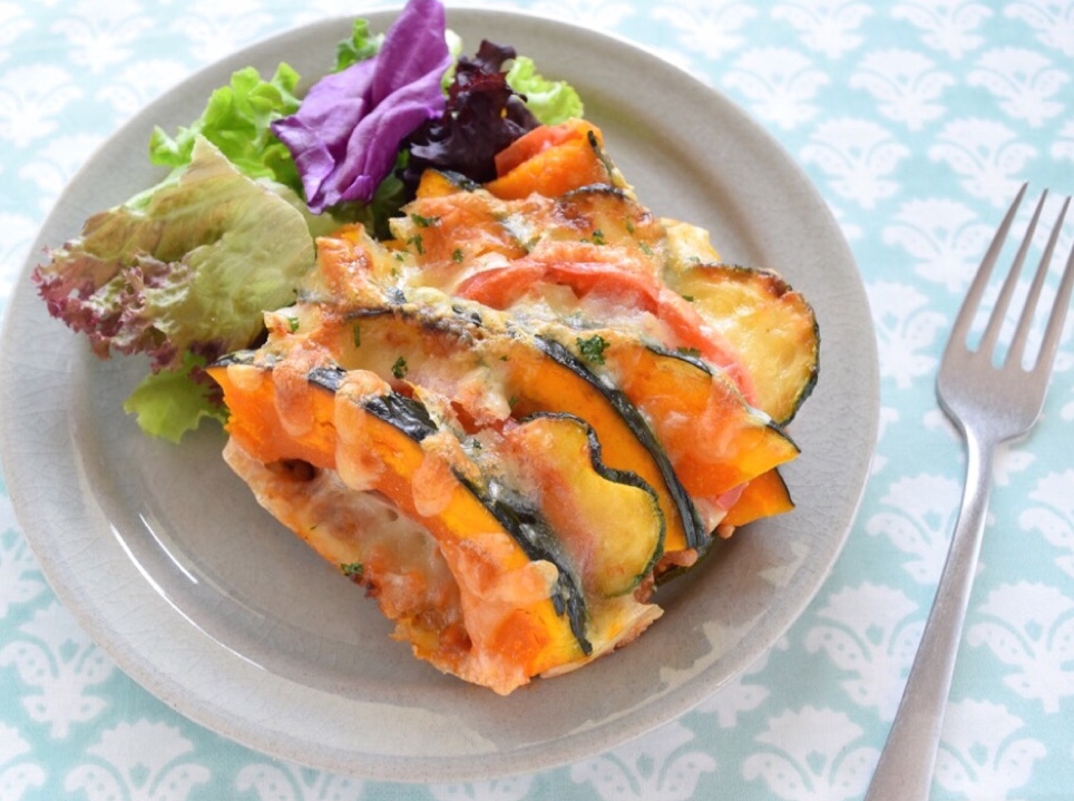 - グラタン皿にズッキーニ、ひき肉、かぼちゃ、ひき肉の順にそれぞれ半量ずつ重ね、残りのかぼちゃ、ズッキーニ、トマトを上に並べる。