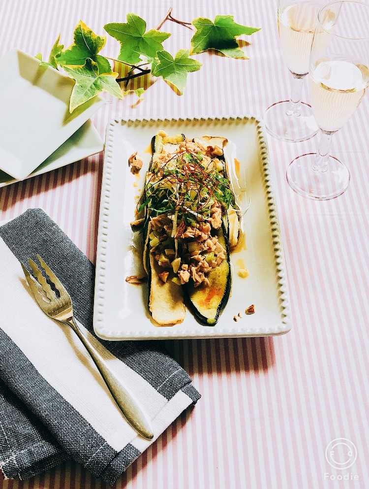 揚げなすとエリンギのピリ辛ツナソースがけ