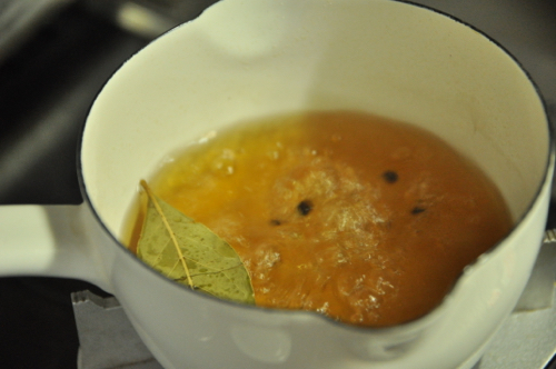 A)のピクルス液は使いまわせます。野菜を取り除くためにザルで漉し、砂糖大さじ1、酢大さじ2入れて、沸騰させます。