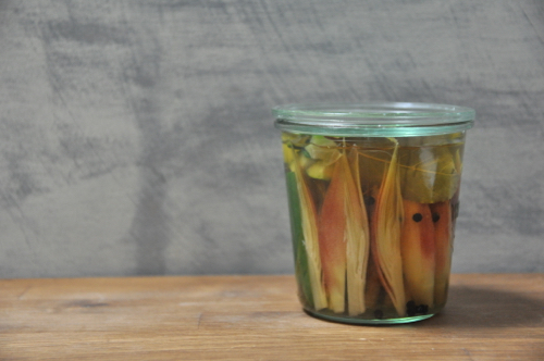 私はBBQの時に、好きな野菜とピクルス液をビニル袋に入れて、持って行きます。人参など固い野菜を食べる時は沸騰したピクルス液の鍋の中に入れて、1分ほど置いておくと、味がしっかりしみます。