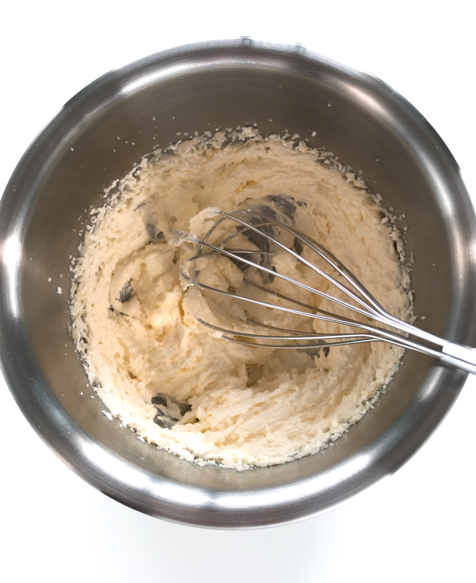 ボウルにバターとグラニュー糖を入れ、白っぽくなるまで泡立て器でしっかり混ぜる。