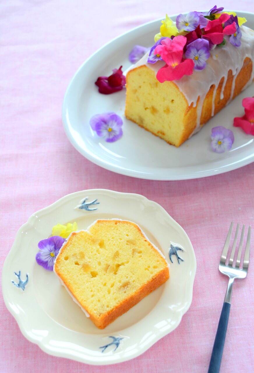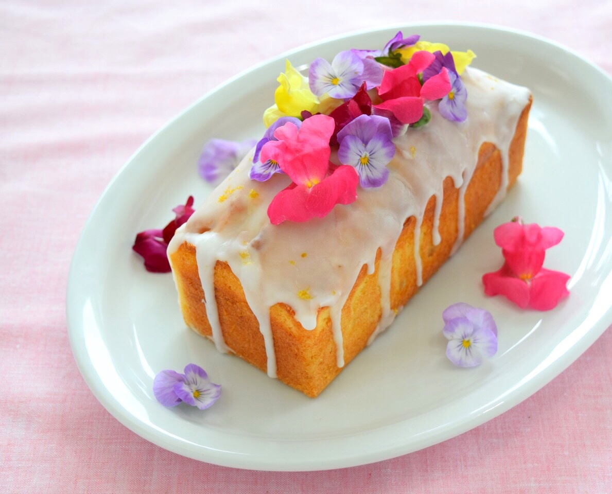 レモンピールとヨーグルトのサッパリした生地にヨーグルトアイシングをかけて仕上げます。エディブルフラワーを飾って華やかなパウンドケーキに。