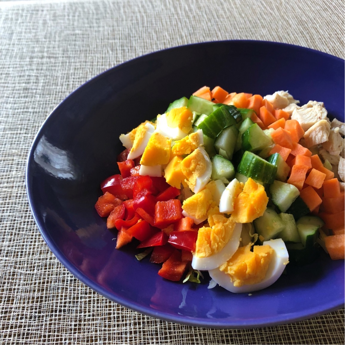 - レモン、きゅうり、パプリカ、にんじん、卵、鶏むね肉をさいの目に切り、皿に盛る。