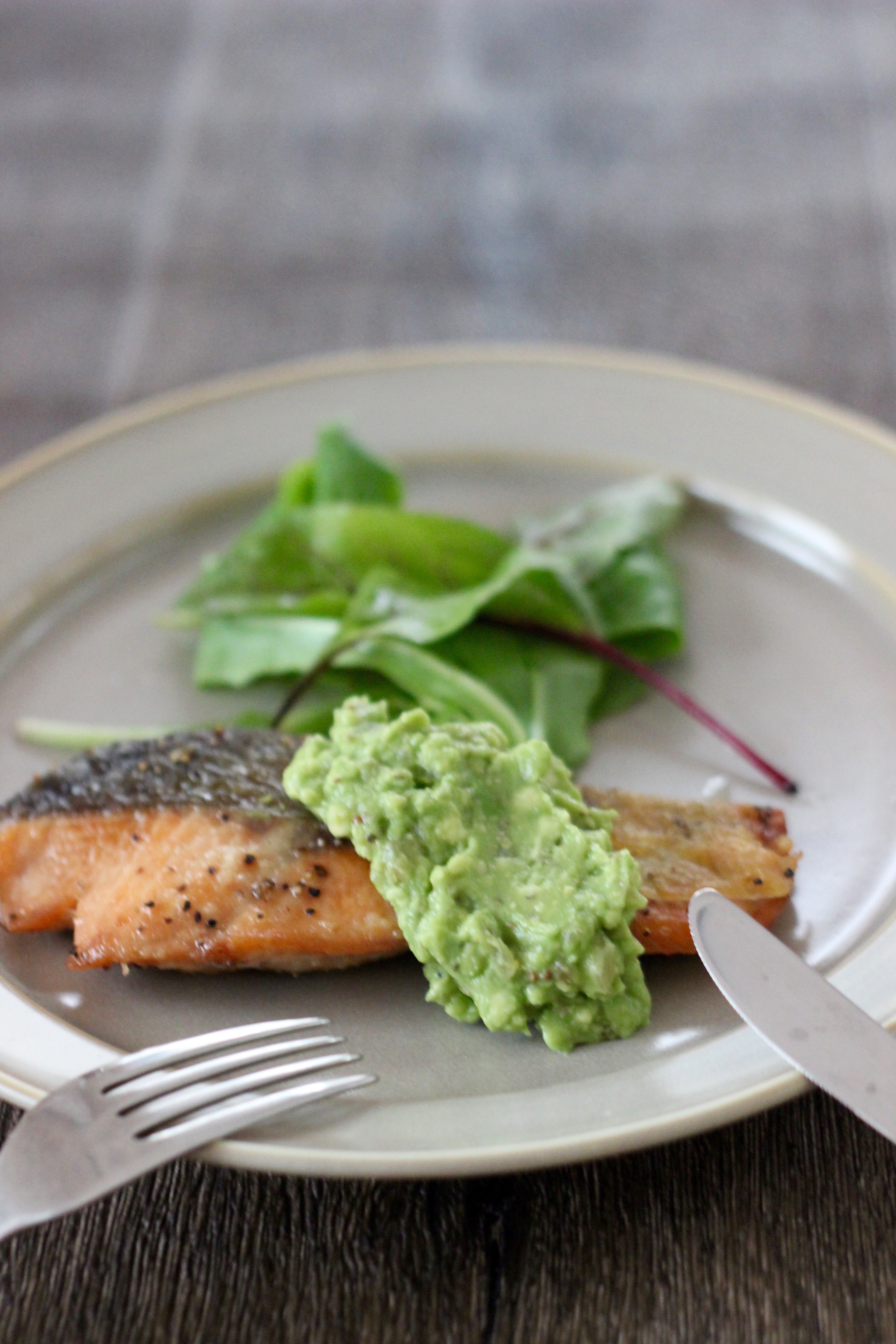 普段はレモンを添える鮭のムニエルに、アボカドソースをかけてみました。