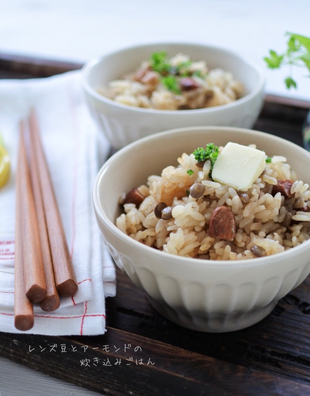 アーモンドとレンズ豆の食感も楽しく、風味のある炊き込みごはんです。