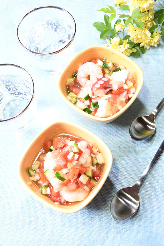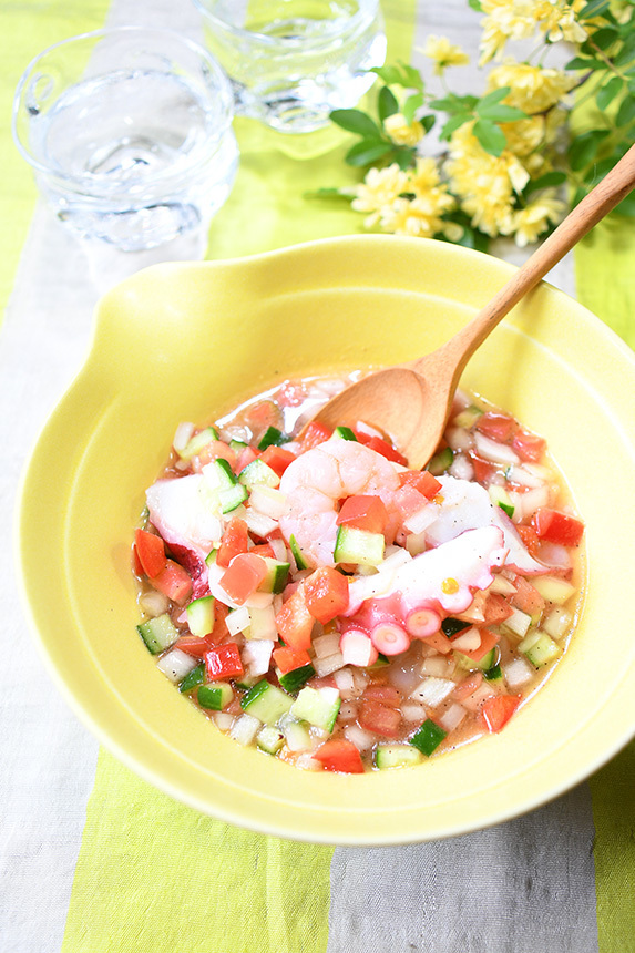 - ゆでだこ、むき海老の水気を拭き取り、[1]に入れて和え、器に盛る。
