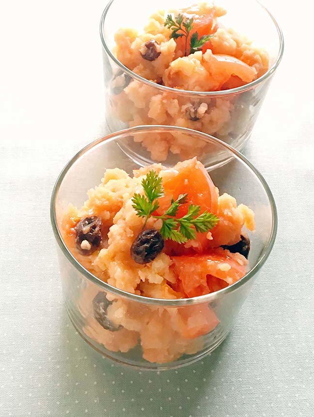 ほんのりピンクに染まったかわいいポテトサラダです。マヨネーズを使わないので、とってもヘルシー。糀トマトを加えることでマヨネーズなしでも、コクがあって、さっぱりとしたポテトサラダに仕上がります。
