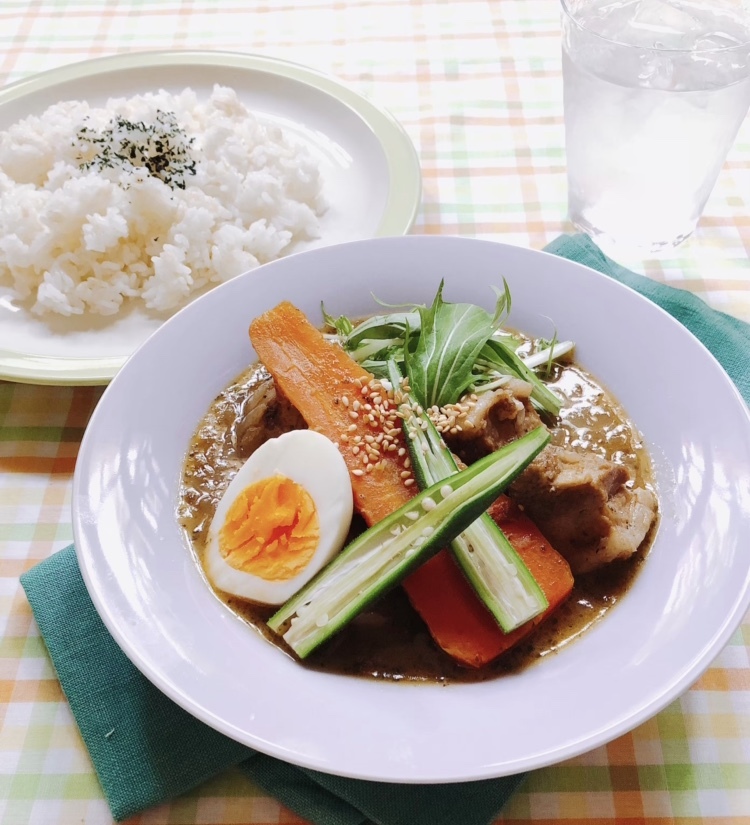 水分量の多さから新玉ねぎはカレーには向かないと言われますが、その特徴を逆に活かしてスープカレーにしました!ゆかりと削り節を加えることで、和風な仕上がりになりました。