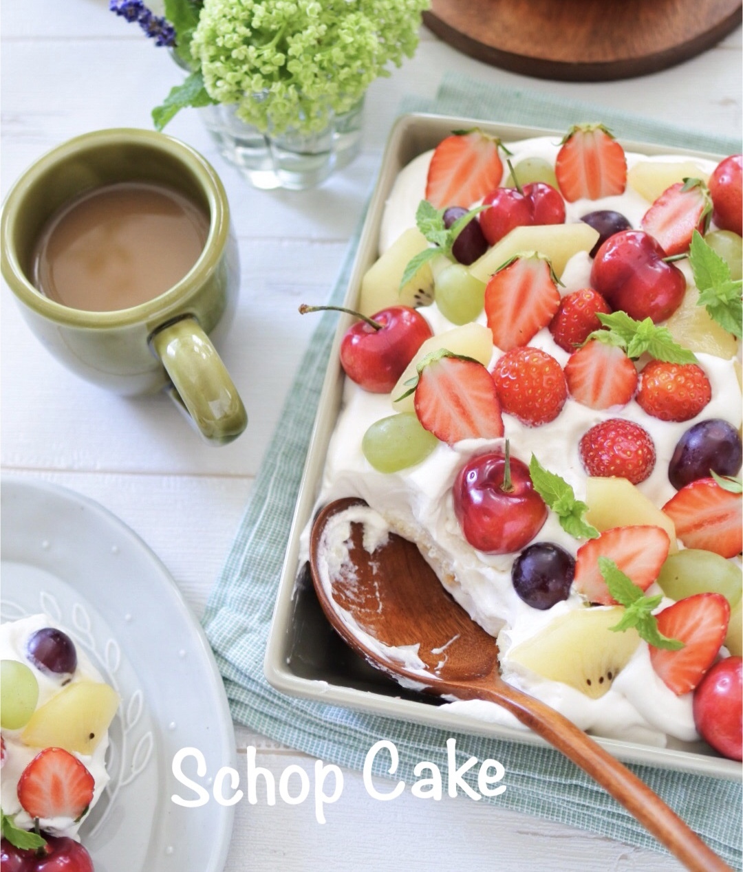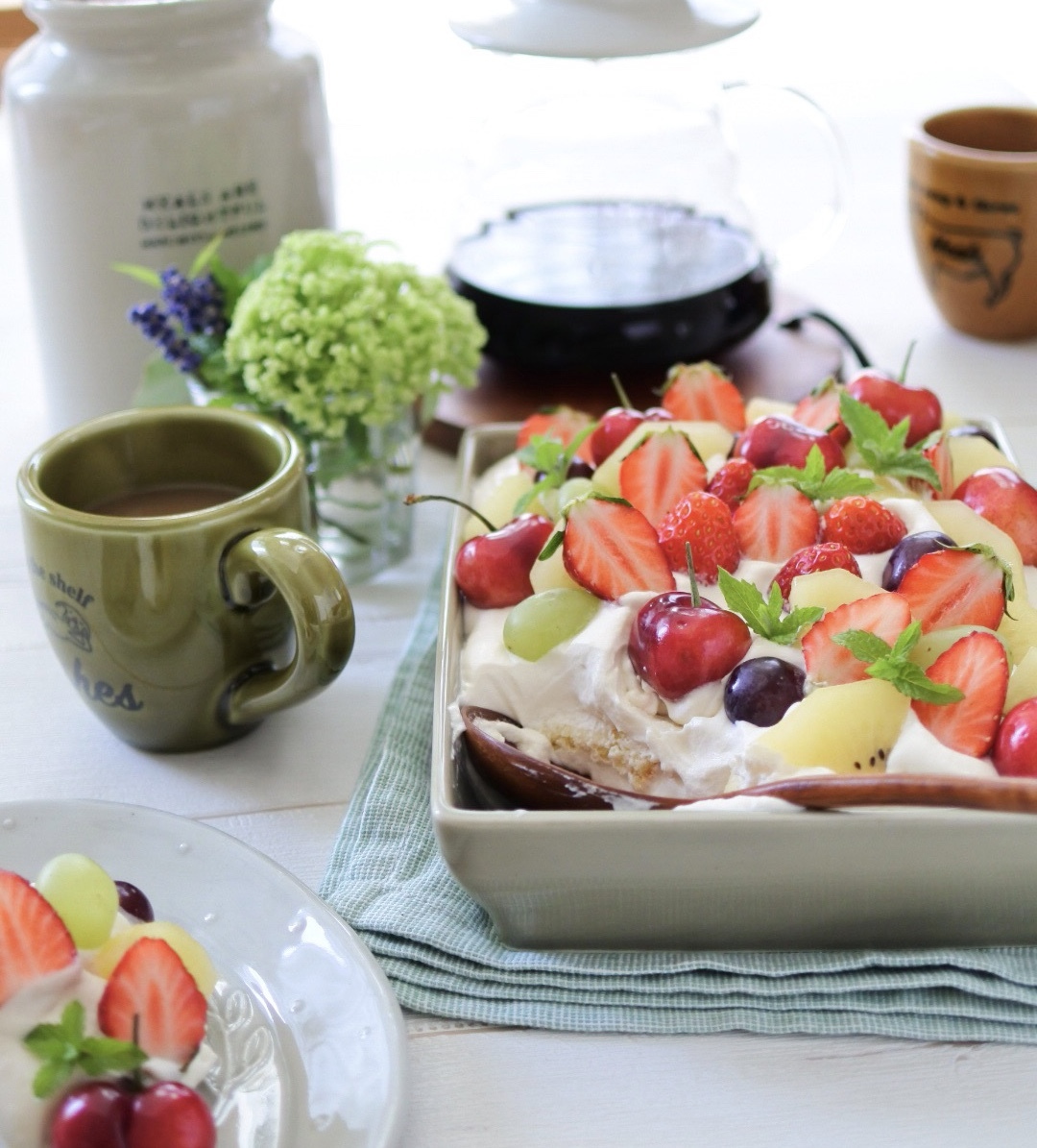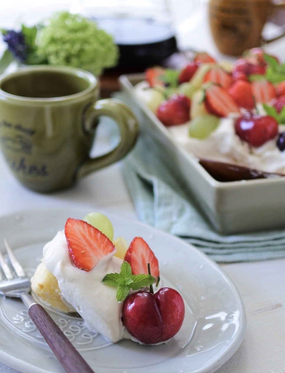 器にスポンジケーキとクリーム、フルーツを飾って、スプーンで取り分ける気軽なケーキです。持ち運びに便利なので、ポットラックパーティーにも!
