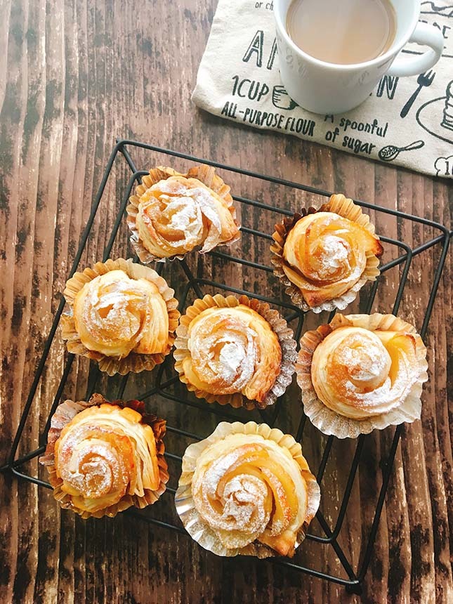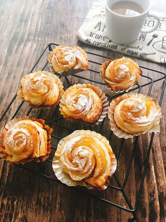 - 6のパイシートに4のりんごを少し重なるようにのせ、端から巻いて薔薇の花のようにする。